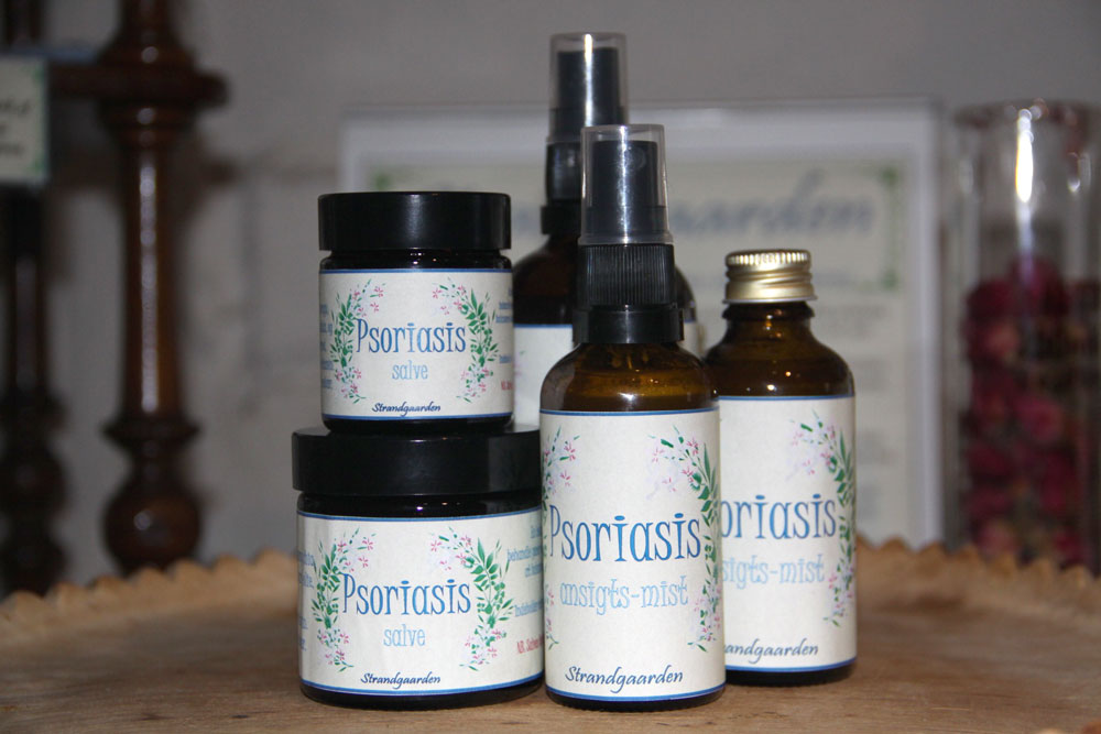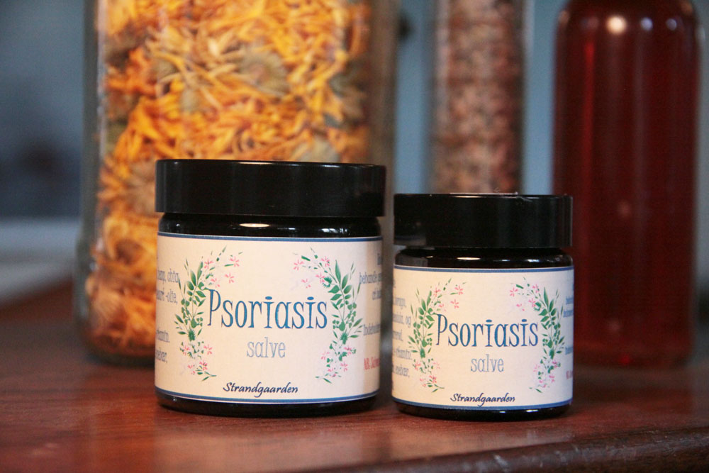 Denne salve indholder udtræk af brændenælde og padderokke. og en fantastisk blanding af eksklusive olier der alle på forskellig vis har en gunstig effekt på huden heriblandt, borago, hemp og chiafrøolie som skulle være særligt gode ved psoriasis. Herudover kæmpenatlysolie, sheasmør og calendula & johannesurtolie. Buerrerod siges at have en regulerende effekt på celledeling og har udrensende egenskaber. Heri tilsat i form af tinktur. E-vitamin som har en særligt helende effekt på huden og æteriske olier af Bergamotte, enebær, geranium, og benzoin. Denne salve har også vist sig god og lindrende hos nogen med eksem, så den kan fint bruges som en “afvekslingssalve” da den indholder udtræk af andre urter og æteriske olier end dem i eksemsalven.